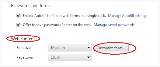 Scroll down till “Web content” and click on “customize fonts”. Fonts and Encoding tab will pop up.