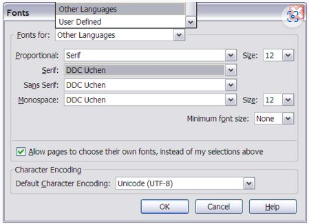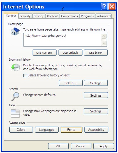 In the list box under Webpage font: select the Dzongkha Font you wish to use as your default (i.e. DDC Uchen).