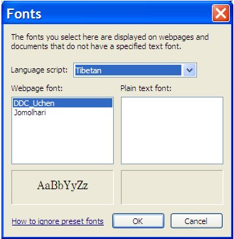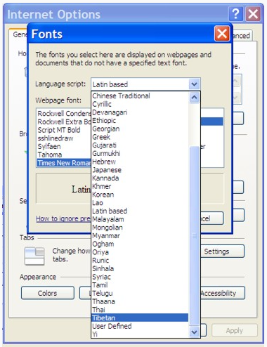 In the Fonts dialog box, in the drop-down list box next to Language script select Tibetan