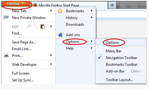 Click on the Firefox button at the top left corner., hover mouse over Options and then click on Options
