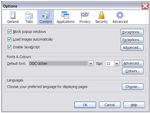 In the Options Content tab, clck on the Advanced… button in the Fonts & Colours section