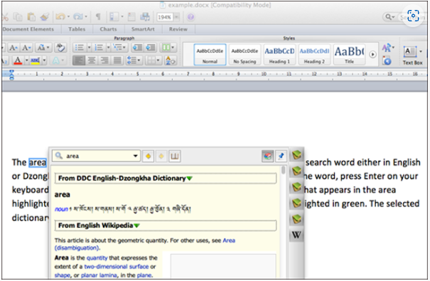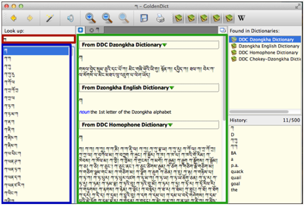 1. The area highlighted in Red is the search field where you can type in your search word either in English or Dzongkha depending on the dictionary of your choice. After typing in the word, press Enter on your keyboard, or select the word of your choice from the possible match list that appears in the area highlighted in blue. The result of your search is displayed in the area highlighted in green. The selected dictionary is also displayed in this area.