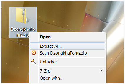 • Once the package has been downloaded, right click on the file and choose “Extract All…" or use a decompression utility such as 7-Zip to extract the files from "DzongkhaFonts.zip".