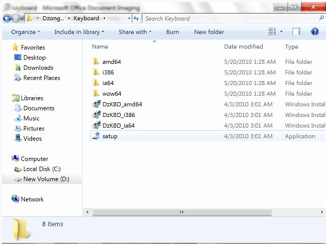 • Double click on the "setup.exe" file. This will automatically install Dzongkha keyboard on your system and, if you have previously installed the Dzongkha locale, it should show the language bar in the taskbar located at the bottom of your screen under OL(Note: It is important to install the keyboard using this Setup utility. In Windows 7 do not try to manually install the Dzongkha keyboard.)