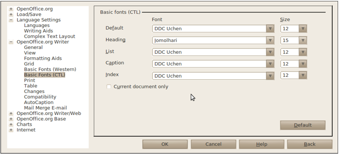 Tools ► Downloads.)DzongkhaFonts.zip)System menu select Preferences ► Keyboard.Add… buttonTools ► Options ► Language Settings ► Languages.“Enhanced Language Support” enable the check box next to “Enabled for complex text layout (CTL).” Complex text layout is required to be able to work with Dzongkha fonts in OpenOffice.In the same dialog box, under “Default languages for documents” for “CTL” select “Dzongkha” and then click on the “OK” button.