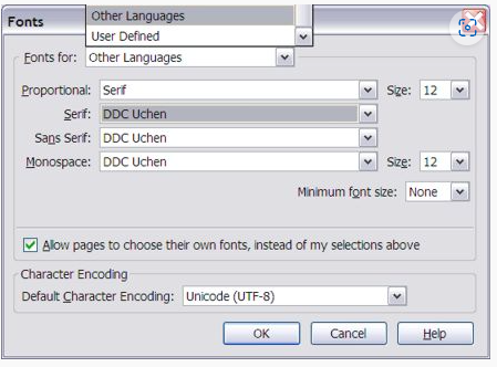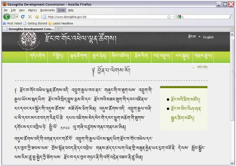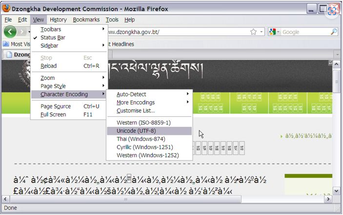 View ► Character Encoding"Unicode (UTF-8)"Tools ►OptionsAdvanced… button in the Fonts & Colors sectionOther Languages.Serif."Unicode (UTF-8".OK button in this dialog box, and again in the Options dialog box.If you prefer to use Dzongkha language rather thaan English language menus etc., install the Dzongkha Localization for Gnome and OpenOffice.